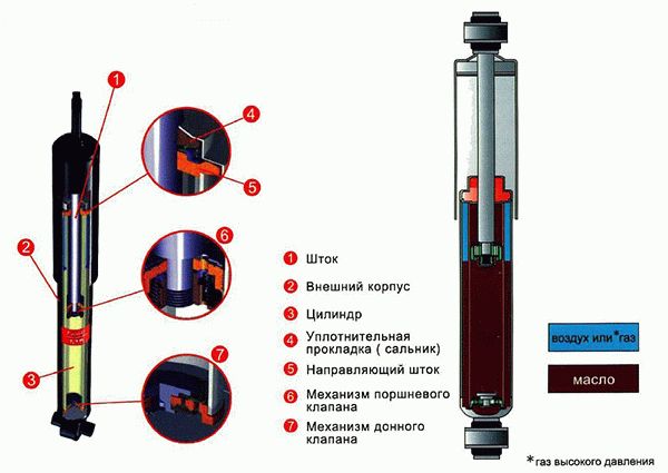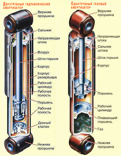 Газомасляные (газовые) устройства лучше гасят колебания, являются более мягкими. Однако газовые модели (не считая тех, где газ отделен от масла специальным поршнем) имеют существенный недостаток. Газ и масло перемешиваются, что нарушает работу детали, понижает ее эффективность и приводит к выходу из строя.