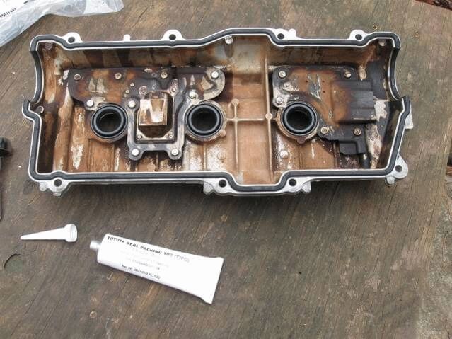 - Нанести слой герметизирующего состава, сняв колпачок, на одну из деталей, распределить наносимый на клапанную крышку слой.