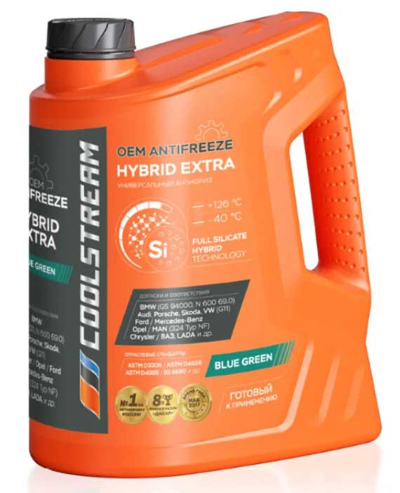 - Гибридные: сделанные на основе смеси силикатов и карбоксилатных кислот. HOAT или Hybrid – международное обозначение. Соединяют достоинства органических антифризов с дешевизной неорганических. Служат 3-5 лет. Пример – Mobil Antifreeze Extra (США).