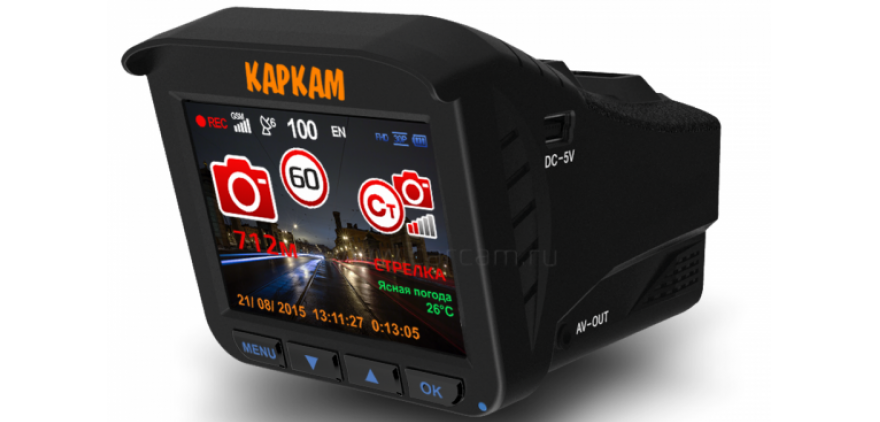 Рейтинг топ-регистраторов 2018 года открывает Каркам Комбо 3S. Это многофункциональное гибридное устройство на базе мощного процессора MSC8328P. Камера снимает видеоролики в разрешении Full HD (1920×1080) с частотой кадров 30 к/с. Широкоугольный объектив с углом обзора 160º состоит из 7 стеклянных линз. Видеосенсор OmniVision OV2710 обеспечивает качественную цветопередачу. Дополнительная камера позволяет фиксировать обстановку сзади и в салоне автомобиля.