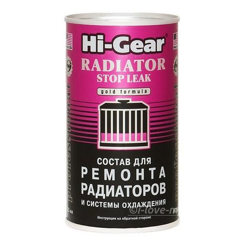 - Hi-Gear Rdiator Stop Leak. Одно из наиболее популярных средств. Стоимость находится в пределах от 350 до 450 рублей. Закрывает даже значительные течи с максимальным линейным размером до 2 мм. Работает как с точечными протечками, так и с пробоями в виде трещин. Средство способно устранить течь через прокладки и в стыках патрубков.