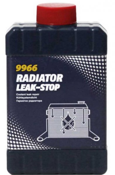 - MANNOL Radiator Leak-Stop. Пожалуй, одно из самых быстродействующих средств. Цена за флакон составляет в среднем 200 рублей. Эффективно и быстро устраняет небольшие утечки. Отверстия, размеры которых превышают 2 мм, средство не герметизирует.
