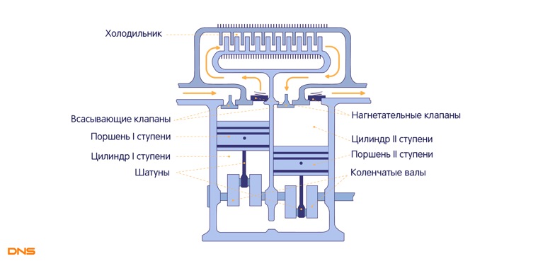 В компрессоре двухступенчатого сжатия всасываемый воздух сжимается дважды: вначале до определенного давления в цилиндре I ступени, затем, пройдя систему охлаждения, под давлением поступает в цилиндр II ступени, где сжимается до конечного давления.